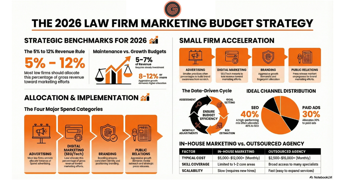 Smaller firms often spend a higher percentage of revenue to build visibility, while larger firms may spend a lower percentage but higher total dollar amount. The right budget depends on your firm’s goals, market, and growth stage.
